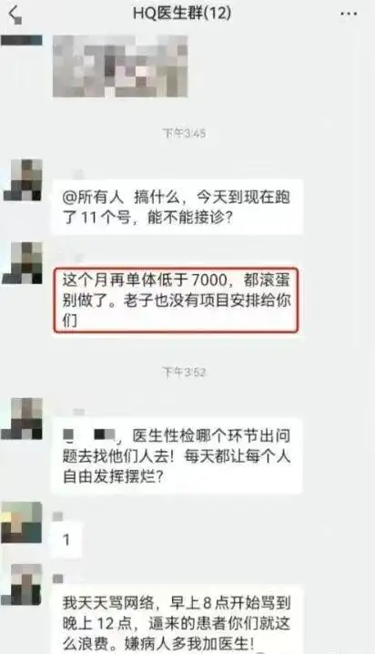 一个令人震惊的案例是,有网友曝光“HQ医生群”的聊天截图,其中一人称“这个月再单体低于7000,都滚蛋别做了”,还扬言“我天天骂网络,早上8点开始骂到晚上12点,逼来的患者你们就这么浪费”。这种将患者视为收入来源、设置最低消费额度的行为,已经彻底背离了医者仁心的初心。