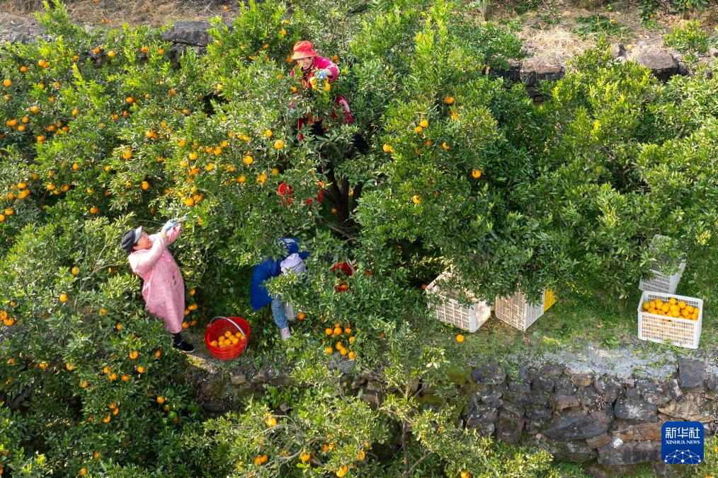 12月11日,在湖北省宜昌市长阳土家族自治县渔峡口镇岩松坪村,村民在整理分拣刚采摘的清江椪柑。